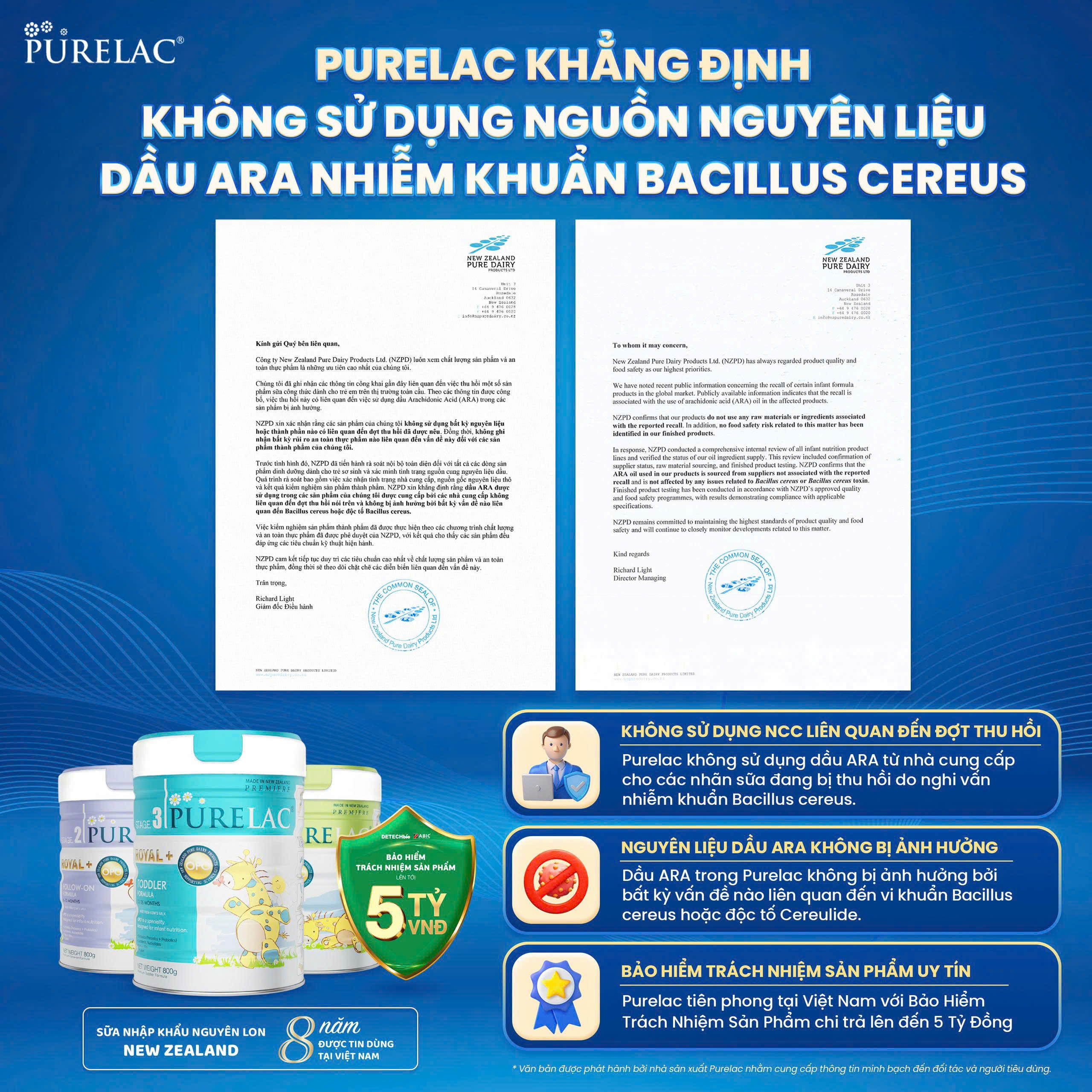 Dầu ARA được sử dụng trong sản phẩm Purelac không bị ảnh hưởng bởi bất kỳ vấn đề nào liên quan đến vi khuẩn Bacillus cereus hoặc độc tố Cereulide.