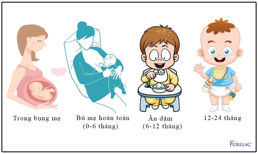 1000 ngày đầu đời của trẻ bao gồm khoảng thời gian trong bụng mẹ đến khi được 2 tuổi. Thời gian này được chia thành 4 giai đoạn: giai đoạn trong bụng mẹ, giai đoạn bú mẹ hoàn toàn (0-6 tháng tuổi), giai đoạn ăn dặm (từ 6-12 tháng tuổi) và giai đoạn từ 12-24 tháng tuổi. Ở mỗi giai đoạn khác nhau nhu cầu dinh dưỡng của trẻ khác nhau.